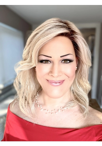 Tabu is a shoulder length wavy style by Ellen Wille and I have her in the color Champagne Rooted, which is just gorgeous and looks like "Shaded Biscuit" by Raquel Welch. She has a "Mini lace front" and a Monofilament crown.