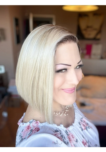 Current Events ist ein toller angled Long Bob mit niedriger Haardichte. Sie hat einen Filmansatz (Lace Front) und einen Monofilament-Scheitel. Sie war das erste und lange Zeit einzige Modell, das in der tollen Farbe "Shaded Iced Sweet Cream" (RL16/22SS) verfügbar war.