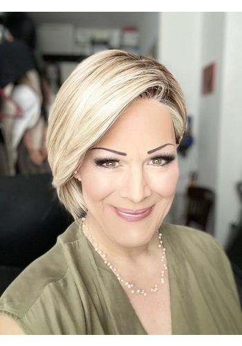 Real Deal ist einer meiner Lieblings-Bobs von Raquel Welch. Sie hat eine leichte A-Line, ist gestuft und hat "razor cut" Spitzen, was ihr einen sehr modernen Look gibt. Besonders hinten sieht man den modernen Schnitt gut. Sie verfügt über einen Filmansatz (Lace Front) und ein komplettes Monofilament-Top, ihr könnt sie also nach Belieben scheiteln.
